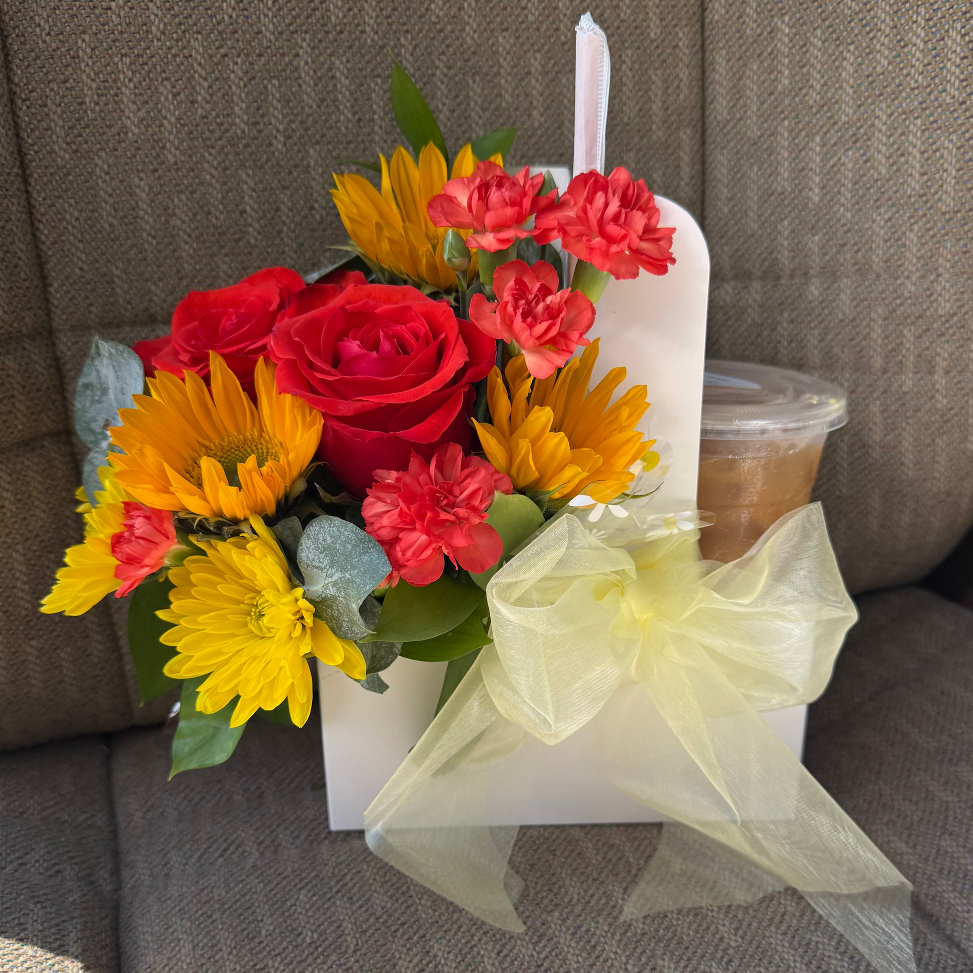 Coffee + Flowers are the perfect blend to send to their home or office. A beautiful, petite floral arrangement with their favorite drink in our cute carrier with gift message & ribbon.